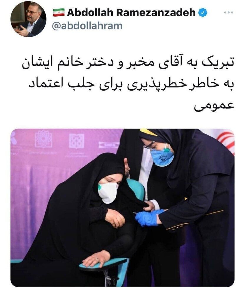 به گزارش «دنیای بورس»، خبر آنلاین نوشت: عبدالله رمضان زاده، سخنگوی دولت اصلاحات، در واکنش به تزریق واکسن ایرانی کرونا به دختر رئیس ستاد اجرایی فرمان امام در توئیتی نوشت: تبریک به آقای مخبر و دختر خانم ایشان به خاطر خطرپذیری برای جلب اعتماد عمومی.