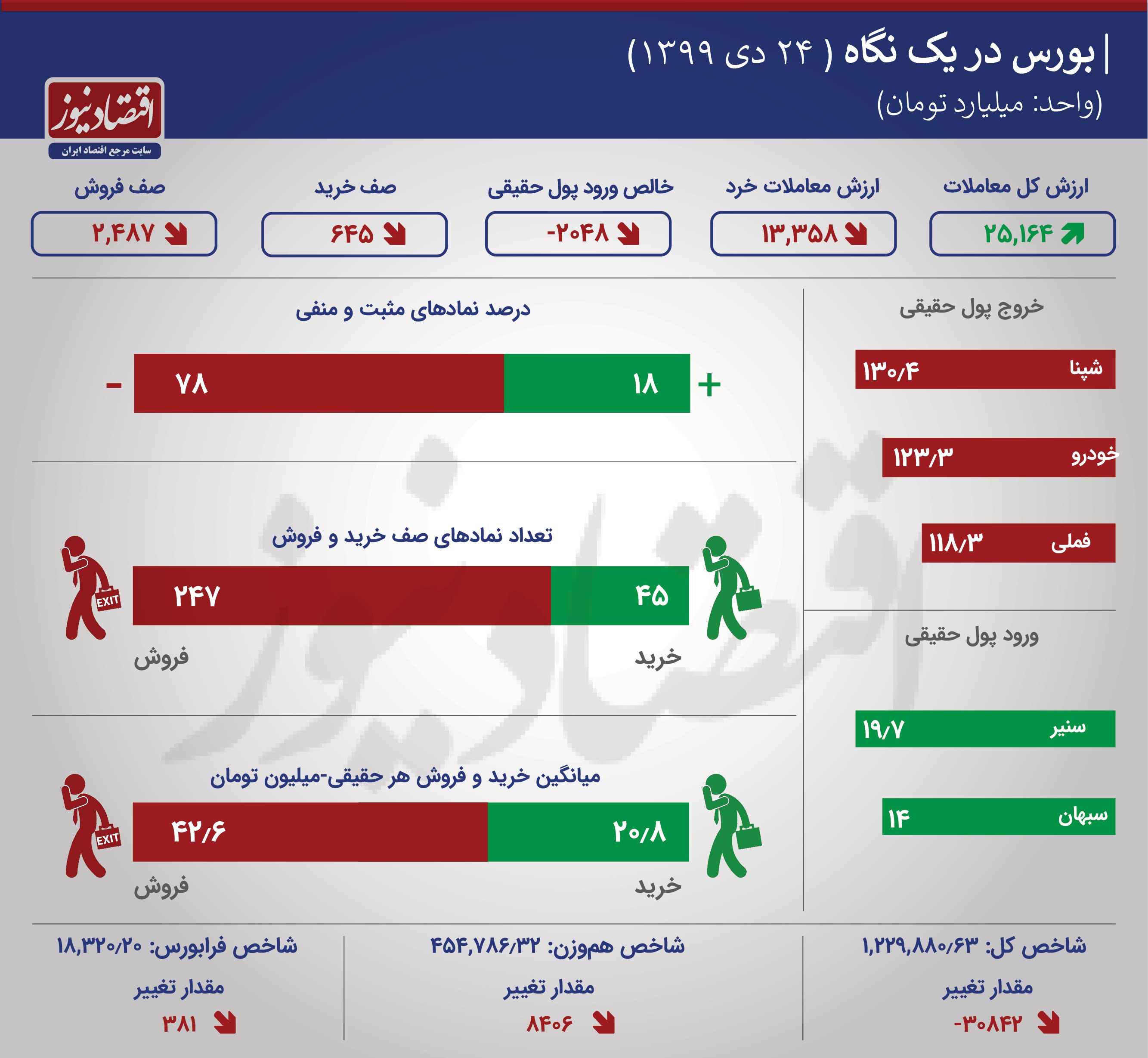 بیشترین خروج پول حقیقی را سهام شپنا (شرکت پالایش نفت اصفهان) داشت که ارزش تغییر مالکیت حقیقی به حقوقی آن بیش از 130 میلیارد تومان بود. پس از شپنا، خودرو (ایران خودرو) و فملی (شرکت ملی صنایع مس ایران) بیشترین خروج پول حقیقی را داشتند.