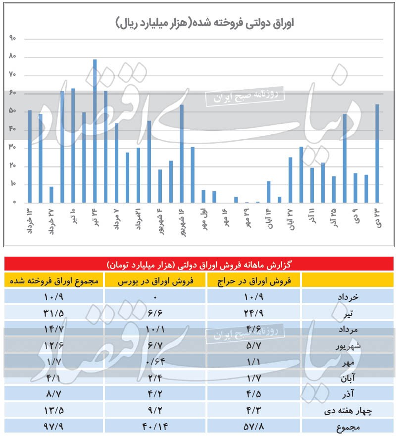 براساس گزارش بانک مرکزی، تا پایان هفته سی و سوم، در مجموع دولت ۹۸ هزار میلیارد تومان از کسری بودجه خود را با فروش اوراق دولتی تامین کرده است. از این مبلغ حدود ۵۸ هزار میلیارد تومان آن از طریق فرآیند حراج و ۴۰ هزار میلیارد تومان آن از فرآیند خارج از حراج و در بورس معامله شده است.
