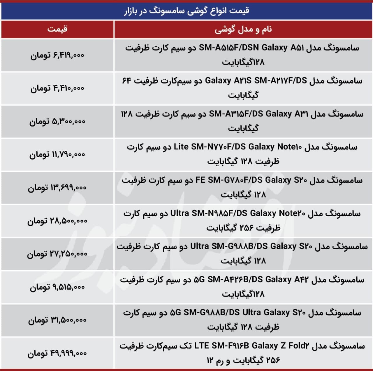 گرانترین گوشی سامسونگ مدل Samsung Galaxy Z Fold2 نیز سه هفته پیش در محدوده قیمتی 60 تا 70 میلیون تومان قرار داشت، اما این روزها در محدوده قیمتی 50 میلیون به فروش می رسد.