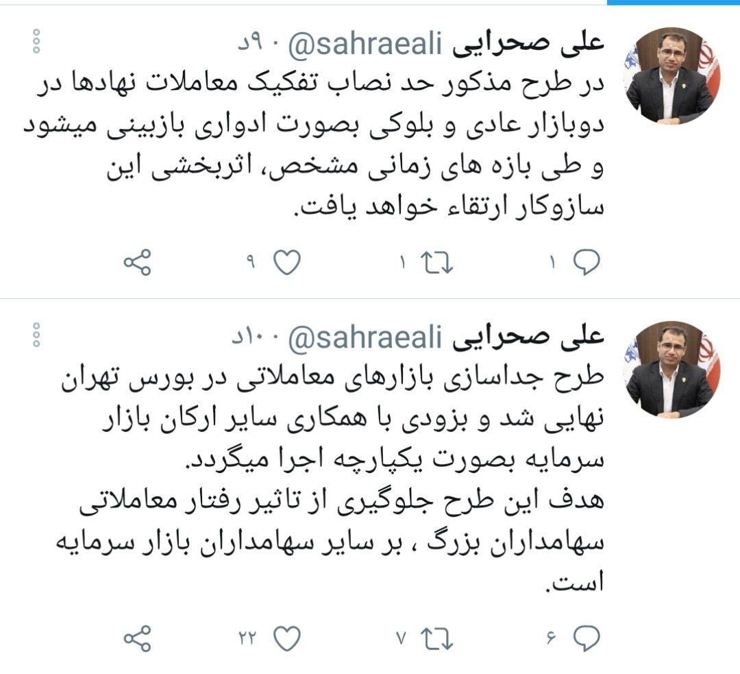 علی صحرایی، مدیرعامل بورس تهران درباره طرح جداسازی بازارهای معاملاتی در بورس چه توییت کرد.