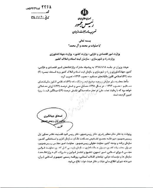 ضمنا در مواردی که میزان ارزش معاملاتی املاک توسط دستگاهها و سایر مراجع قانونی از ادارات امور مالیاتی استعلام میشود، موضوع ضرورت رعایت نصاب یادشده را در پاسخ به استعلامات مربوط مورد تأکید قرار دهند. این مصوبه از سوی اسحاق جهانگیری معاون اول رییس جمهوری برای اجرا ابلاغ شده است.
