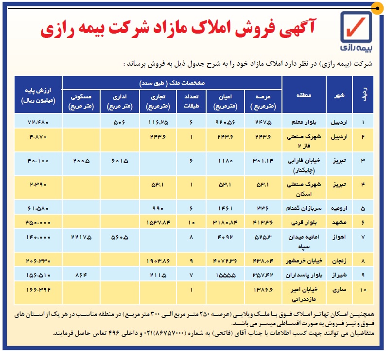 دنیای بورس: بر مبنای آگهی منتشره بیمه رازی، این مجموعه قصد دارد با تعیین شرایط معین و مشخص املاک مازاد خود را در سراسر کشور به فروش بگذارد.