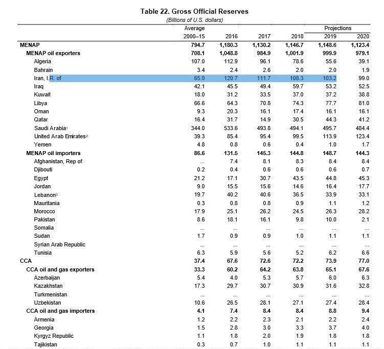 براساس پیشبینی این نهاد بین المللی با وجود تلاشهای آمریکا برای فشار حداکثری به اقتصاد ایران ذخایر ارزی ایران در سال 2019 همچنان بالای 100 میلیارد دلار باقی خواهد ماند و ایران رتبه سوم خود در منطقه را از نظر میزای ذخایر ارزی خود حفظ خواهد کرد.