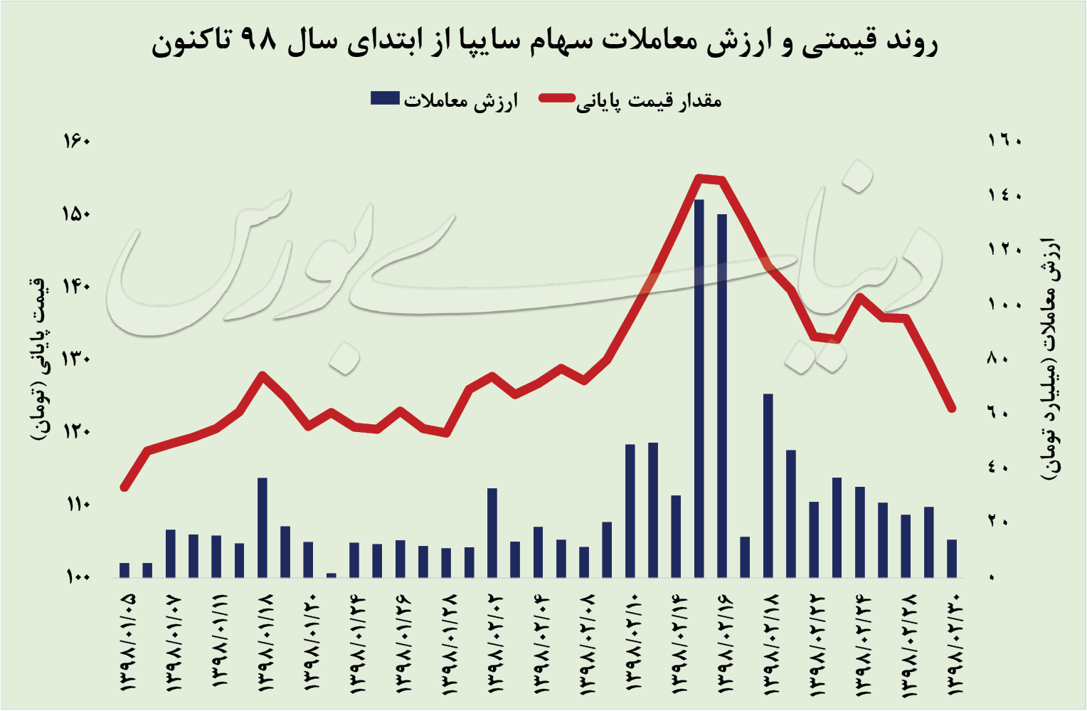 دنیای بورس: همانطور که در نمودار مشاهده میشود که سهام سایپا از سطوحی نزدیک به قیمتهای کنونی در روزهای پایانی فروردین مسیر صعودی پرشتاب همراه با رشد محسوس حجم و ارزش معاملات آغاز کرد. با این حال به دنبال سیگنالهای بنیادی ضعیف و بر اساس آنچه پیشتر در خصوص خودروییها هشدار داده شده بود سهام این شرکت به نقطه آغاز حرکت صعودی بازگشته است تا بازدهی دور آخر رالی صعودی سایپا کاملا از بین برود.