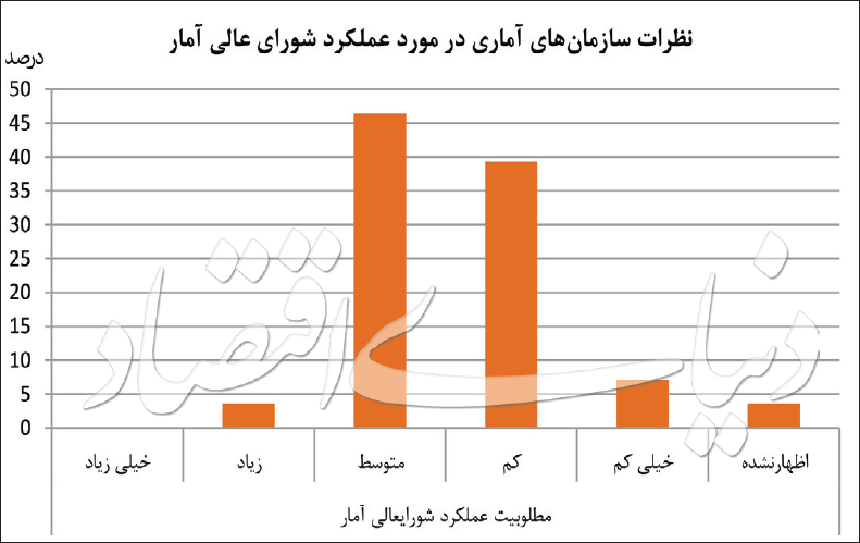 خلاصه مهمترین نتایج نظرسنجی از سازمانها نشان میدهد که نیمی از سازمانهای آماری میزان حقوق کارکنان را با میزان فعالیت خود متناسب نمیدانند. ۳۲ درصد از سازمانها، آمار تولیدی خود را کاملا منطبق با استانداردهای آماری توسط سازمان ملل متحد نمیدانند. تنها ۳۲ درصد از سازمانها میزان همکاری پاسخگویان را به سوالات خوب ارزیابی کردهاند. ۵۲ درصد از سازمانها میزان همکاری مرکز آمار ایران با سایر واحدهای آماری را متوسط یا ضعیف ارزیابی کرده و مرکز آمار این موضوع را متوسط ارزیابی کرده است.
