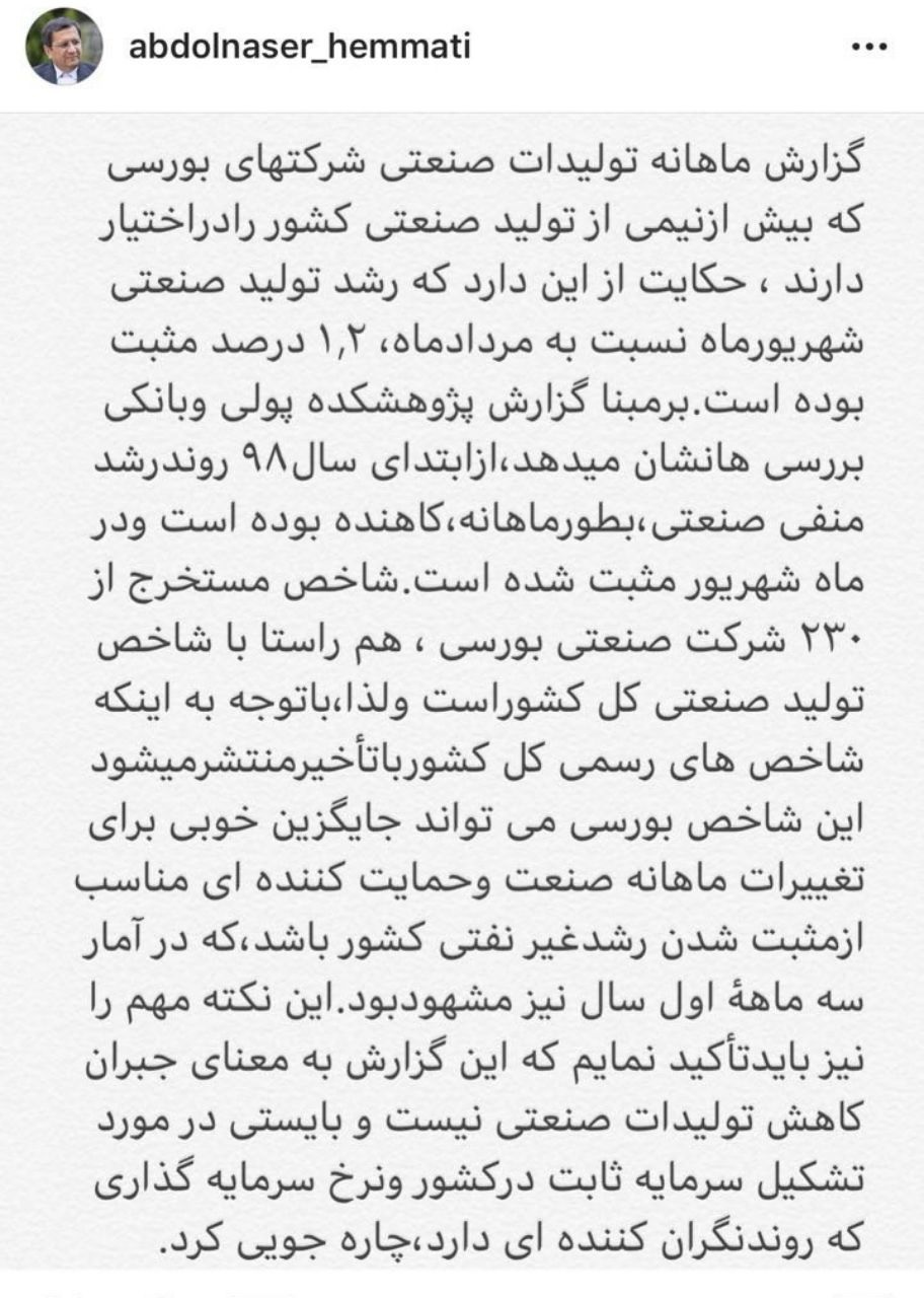 دنیای بورس: به گفته عبدالناصر همتی از ابتدای سال۹۸ روند رشد منفی صنعتی، بهطور ماهانه، کاهنده بوده و در ماه شهریور مثبت شده است. این گزارش به معنای جبران کاهش تولیدات صنعتی نیست و باید در خصوص تشکیل سرمایه ثابت ناخالص داخلی کشور و نرخ سرمایهگذاری که روند نگران کنندهای دارد، چارهجویی کرد.