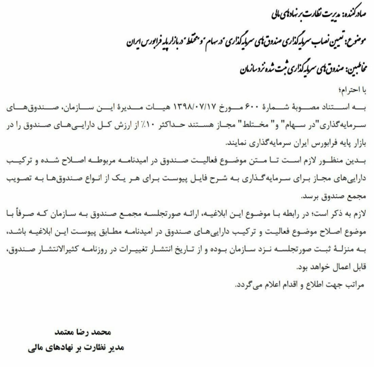 دنیای بورس: بر مبنای بخشنامه تعیین نصاب سرمایهگذاری صندوقهای سرمایهگذاری در «سهام » و «مختلط» در بازار پایه فرابورس ایران تاکید شد که حداکثر 10 درصد از ارزش کل دارایی صندوقها مجاز هستند در بازار پایه حضور داشته باشند.