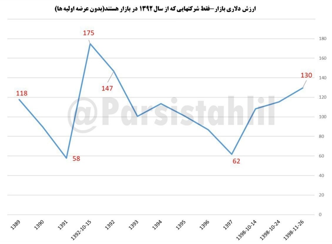 نمودار ارزش دلاری بازار بورس در سال 1389 تا ارزش دلاری بازار در 26 بهمن 1398 (تنها شرکتهایی که در سال 1392 در بازار بوده اند در این نمودار لحاظ شده اند) منتشر شد.