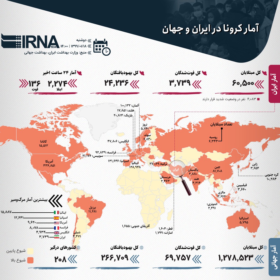 دکتر جهانپور افزود: از دیروز تا امروز و بر اساس معیارهای قطعی تشخیصی ۲۲۷۴ بیمار جدید مبتلا به کووید ۱۹ در کشور شناسایی شد. وی گفت: احتساب موارد جدید، مجموع بیماران کووید۱۹ در کشور به ۶۰۵۰۰ نفر رسیده است.