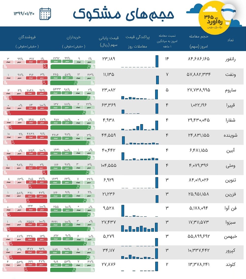 در ادامه هم شرکت های سرمایه گذاری نفت، سیمان ارومیه، قند پیرانشهر، پتروشیمی فارابی، مدیریت صنعت شوینده ت.ص بهشهر، کشت و صنعت آبشیرین، گروه صنعتی ملی، تامین سرمایه نوین، زرین معدن آسیا، فن آوا، سیمان لار سبزوار، گروه بهمن، فرآوری زغال سنگ پروده طبس و کاشی الوند مشمول معاملات مشکوک امروز شدند.