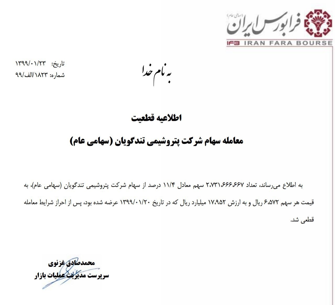 به گزارش «دنیای بورس» به نقل از فرابورس»، تعداد ٢،٧٣١،٦٦٦،٦٦٧ سهم معادل ١١.٤ درصد از سهام پتروشيمي تندگويان به قيمت هر سهم ٦،٥٧٢ ريال و به ارزش ١٧،٩٥٢ ميليارد ريال كه در تاريخ ٩٩.٠١.٢٠ عرضه شده بود پس از احراز شرايط معامله قطعي شد. شركت پتروشیمی بوعلی- خريدار بلوك پتروشيمي تندگويان" شگويا" است.