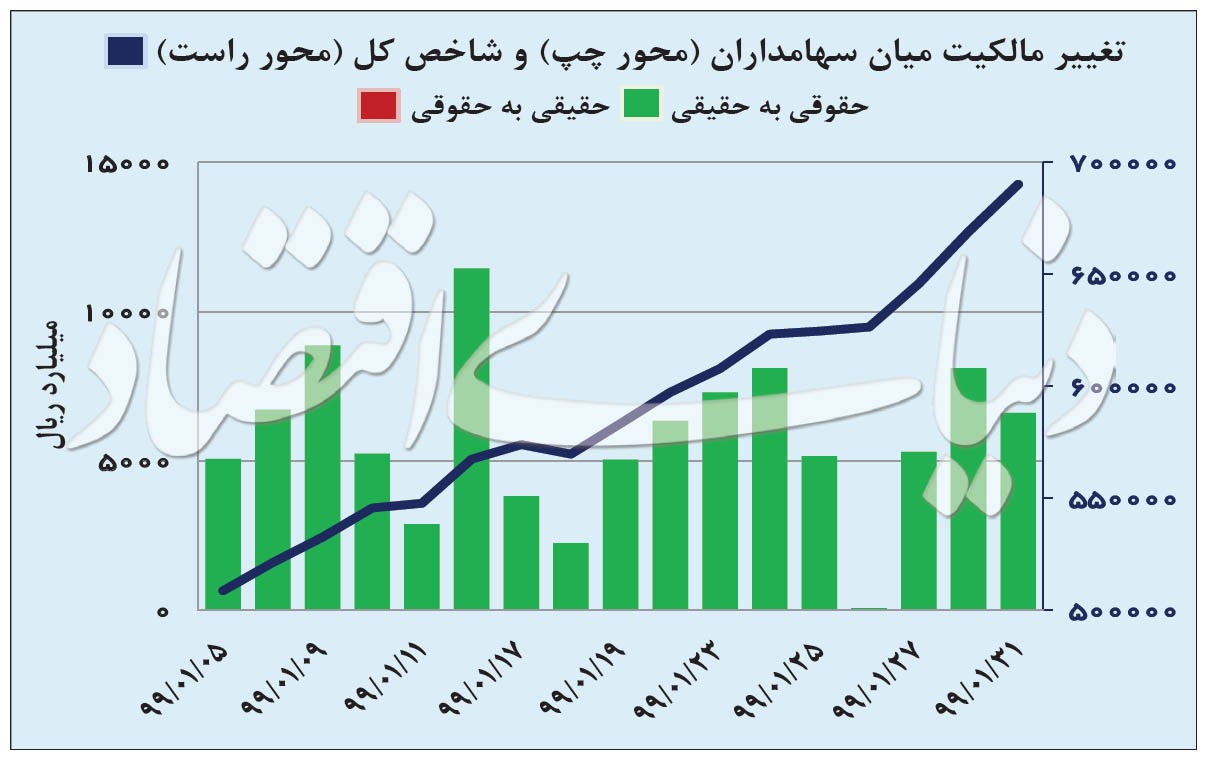 در این میان، حقیقیها و معاملهگران خرد نیز برای ورود نقدینگی جدید به بازار با سبقت از یکدیگر، خالص ارزش معاملات خرد بورس تهران را تا بیش از 10 هزار میلیارد تومان ارتقا بخشیدند. بهطوری که میانگین روزانه این متغیر با رشد بیش از 43 درصدی در مقیاس ماهانه به حدود 5800 میلیارد تومان رسید. ضمن آنکه در فروردین 99 شاهد جابهجایی 9828 میلیارد تومان نقدینگی از پرتفوی حقوقیها به سبد سهام معاملهگران حقیقی بازار بودیم که در نیم قرن فعالیت بورس تهران رقمی بیسابقه بود.