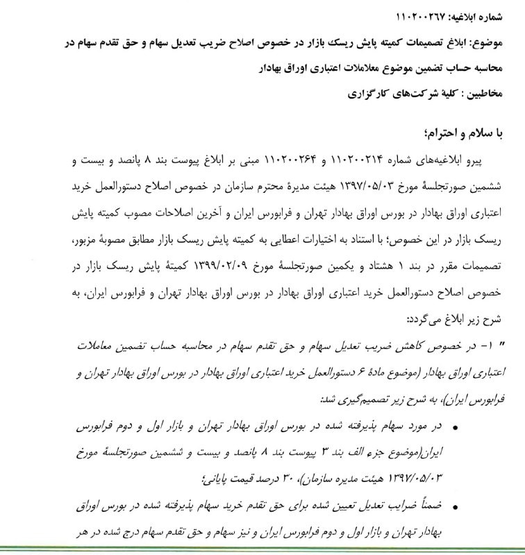 طبق ابلاغیه کمیته پایش ریسک بازار، کاهش ضرایب تضمین اعتباری خرید سهام از ۳۵ درصد به ۳۰ درصد میرسد.