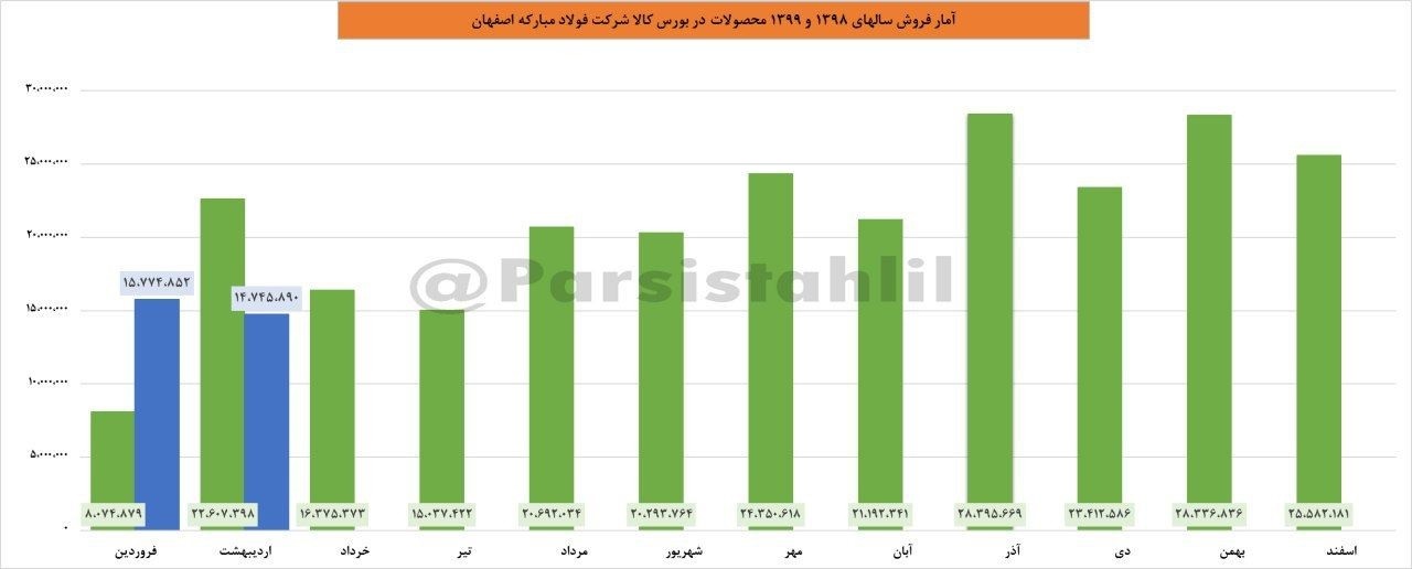 به گزارش «دنیای بورس»، فولاد در 24 روز ابتدایی اردیبهشت 1399، آمار معاملات در رینگ صنعتی بورس کالا 1475 میلیارد تومان بوده است. به دلیل ابطال معاملات، فروش چندانی فولاد مبارکه در اردیبهشت نداشته است. در نمودار فوق روند ارزش معاملات از ابتدای سال 1398 قابل مشاهده است.