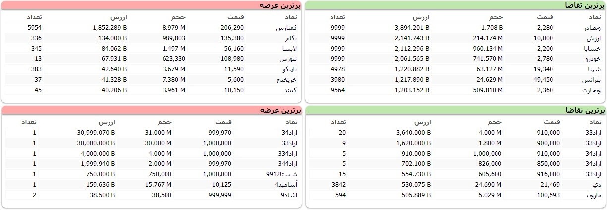 در تصویر روبه روز صف های خرید و فروش جدول اول- بالایی (بورس) و جدول دوم- پایینی (فرابورس) قابل مشاهده است.
