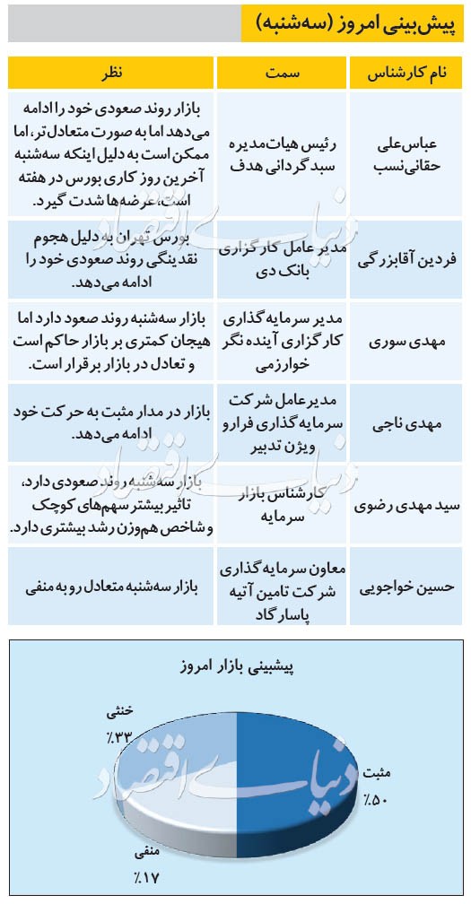 به گزارش «دنیای بورس»، امروز تحلیلگران چه پیش بینی از بازار داشتند. بسیاری برای بازار روند صعودی و البته در حالت بدبینانه تعادلی پیش بینی کرده بودند. امروز شاخص بیش از 29 هزار واحد افزایش یافت و در کانال بالای یک میلیون و 200 هزار وحد تثبیت شد. ارزش معاملات امروز به 16 هزار میلیارد تومان رسید و میزان ورودی پول حقیقی ها بیش از 800 میلیارد تومان برآورد شد تا نتیجه پیش بینی ها تقریبا درست از آب درآید.