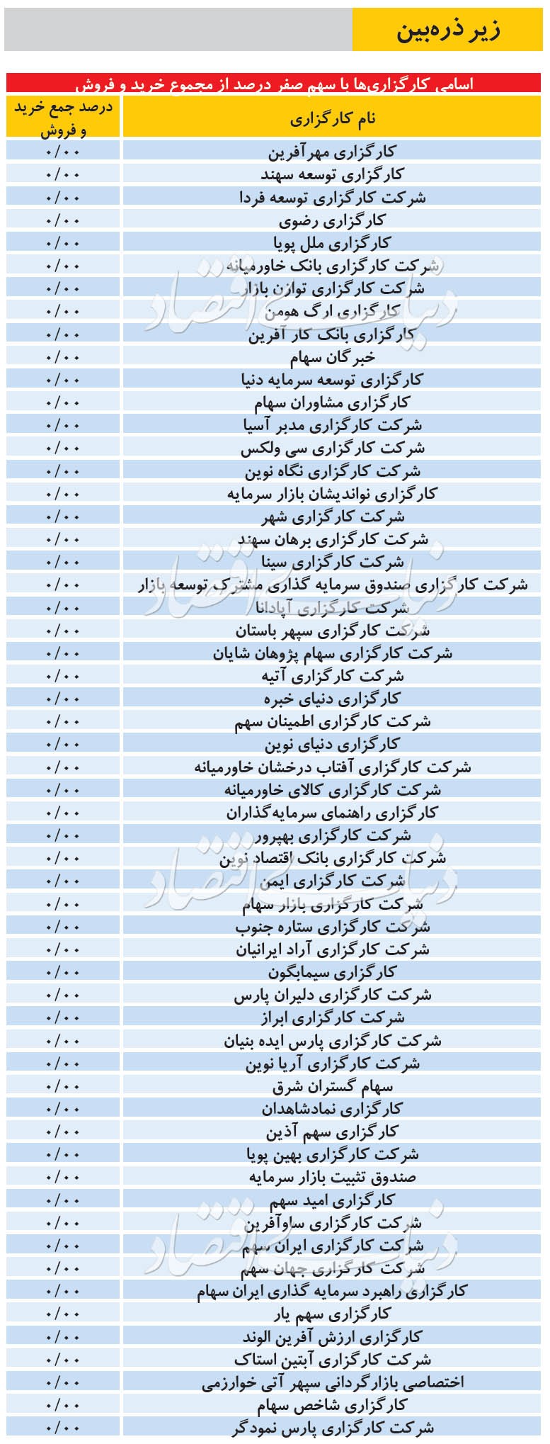 در جدول روبه رو، اسامی کارگزاری هایی که از خرید و فروش سهم صفر درصدی داشتند، آمده است.