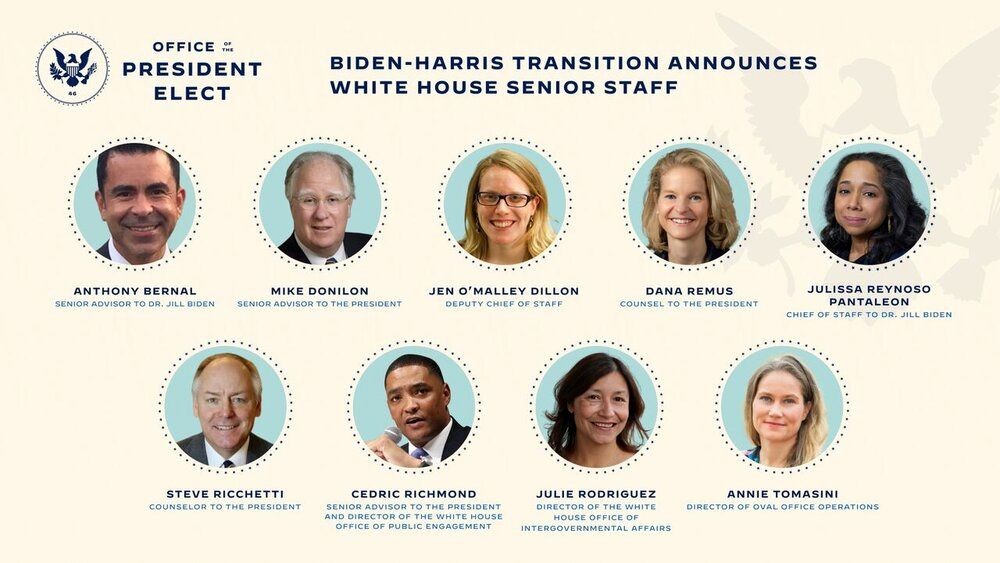به گزارش «دنیای بورس»، ایرنا نوشت: در توییت دیروز (۲۷ آبان) تیم انتقالی دولت جو بایدن ۹ تن از جمله برخی از دستاندرکاران ستاد انتخاباتی بایدن و تعدادی از نزدیکان و مشاوران وی به عنوان کادر ارشد کاخ سفید در دولت آتی معرفی شدهاند: آنتونی برنال، مایک دانیلن، جن اومالی دیلن، دانا راموس، جولیسا رینوسو پانتالئون، استیو ریچتی، سدریک ریچموند، جولی رودریگز و آنی توماسینی.