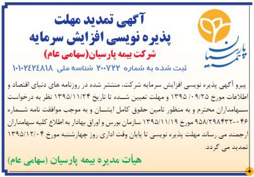 بیمه پارسیان آگهی تمدید پذیرهنویسی افزایش سرمایه را منتشر کرد که براساس آن مهلت پذیرهنویسی تا پایان وقت اداری روز چهارشنبه 4 بهمن ماه سال جاری تمدید میشود. بیمه پارسیان با افزایش 100 درصدی میخواهد سرمایه خود را از 2 هزار میلیارد ریال به 4 هزار میلیارد ریال برساند.