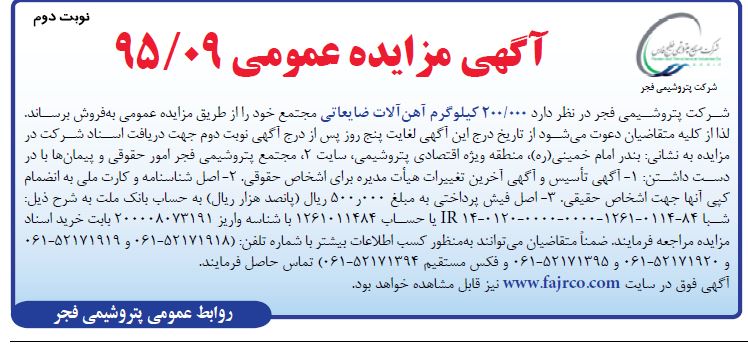 پتروشیمی فجر امروز با انتشار آگهی از فروش 200هزار کیلوگرم آهن آلات ضایعاتی به صورت مزایده خبر داده است.