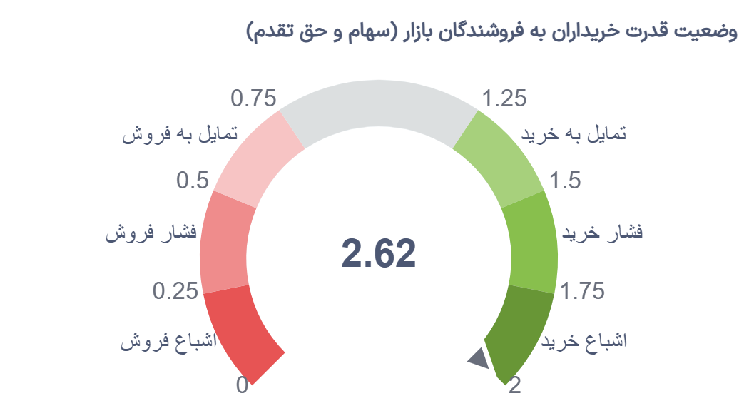 نگاهی به وضعیت قدرت خریداران به فروشندگان بازار سهم از منظر معاملات سهام و حق تقدم، گویای آن است که خرید در منطقه اشباع خرید قرار دارد. این وضعیت در معاملات صندوق های سهامی نیز به همین شکل دیده می شود.