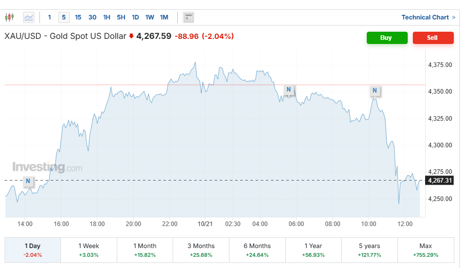 طلای نقدی (اسپات) با ۰.۳ درصد کاهش به ۴,۳۴۰.۲۹ دلار در هر اونس رسید (تا ساعت ۰۲:۴۸ به وقت گرینویچ)، در حالی که روز دوشنبه به بالاترین رکورد تاریخ، یعنی ۴,۳۸۱.۲۱ دلار رسیده بود. قراردادهای آتی طلای آمریکا برای تحویل در دسامبر نیز ۰.۱ درصد کاهش یافت و به ۴,۳۵۶.۴۰ دلار در هر اونس رسید.