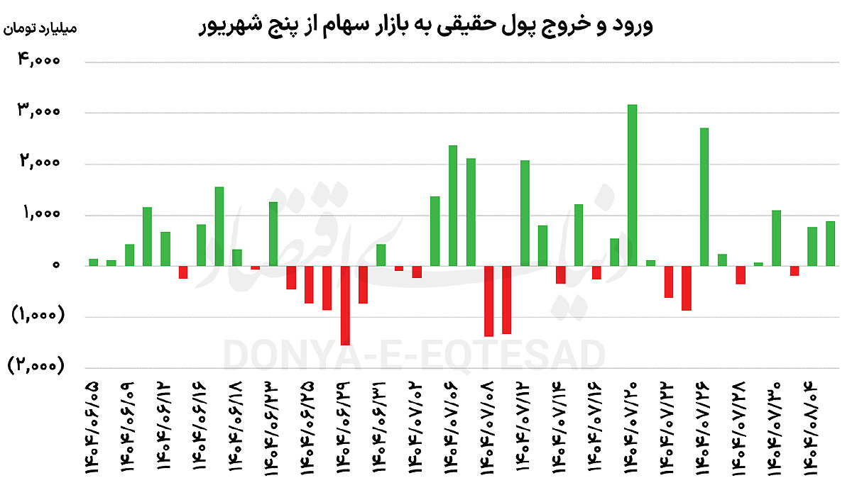 آرام شدن فضا نه تنها به بهبود فضای روانی فعالان بازار منجر شد، بلکه مسیر ورود دوباره پول حقیقی به بازار را هموار کرد و نقدینگی تازهای را وارد گردونه معاملات کرد. از پنجم شهریور تاکنون، حدود ۱۶هزار و ۲۰۰میلیارد تومان پول حقیقی وارد بازار سهام شده است؛ رقمی قابلتوجه که در کنار رشد ارزش معاملات خرد و افزایش تعداد نمادهای مثبت، از بهبود انتظارات و بازگشت اعتماد سرمایهگذاران به این بازار حکایت دارد.