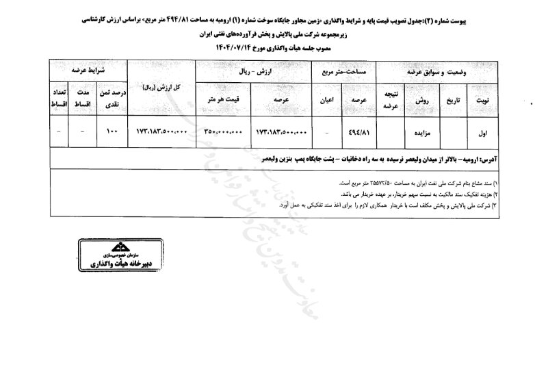 افزون براین، در این جلسه قیمت پایه و شرایط واگذاری زمین مجاور جایگاه سوخت شماره (۱) ارومیه به مساحت ۴۹۴/۸۱ متر مربع متعلق به شرکت ملی پالایش و پخش فرآورده های نفتی ایران مطرح و با واگذاری زمین مذکور بر اساس ارزش کارشناسی به مبلغ ۱۸۳،۵۰۰،۰۰۰، ۱۷۳ ریال به صورت نقد از طریق مزایده عمومی موافقت شد.