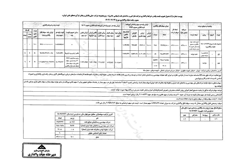 بر اساس مصوبات چهارصدوچهلمین جلسه هیات واگذاری قیمت پایه و شرایط واگذاری ۴۹ درصد سهام شرکت طراحی و ساختمان نفت (سهامی خاص) متعلق به شرکت ملی پالایش و پخش فرآوردههای نفتی ایران ۴۸/۹۶ درصد سهام متعلق به شرکت ملی مهندسی و ساختمان نفت ایران و ۰/۰۵ درصد سهام متعلق به شرکت خطوط لوله و مخابرات نفت ایران مطرح و با واگذاری سهام مذکور پس از کسر سهام ترجیحی بر اساس روش سودآوری با لحاظ ۳۰ درصد ارزش سهام عادی بابت سهام ممتاز به اضافه نظر هیأت واگذاری با قیمت پایه هر سهم به مبلغ ۴،۰۲۹،۷۱۲ ریال جمعاً به ارزش ۱۰۲۸۸۹،۲۱۸۰۰۳۷۳۷۶ ریال و با شرایط ۳۰ درصد نقد و مابقی در اقساط ۳ ساله طی ۶ قسط با فواصل زمانی ۶ ماهه از طریق مزایده عمومی موافقت شد.