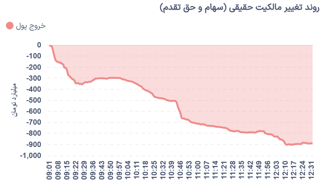 بررسی تغییرات مالکیت سهام و حق تقدم نیز نشان میدهد که جریان خروج پول حقیقی از بازار همچنان ادامه دارد؛ روندی که از ابتدای معاملات منفی آغاز شد و تا پایان روز نیز تداوم یافت.