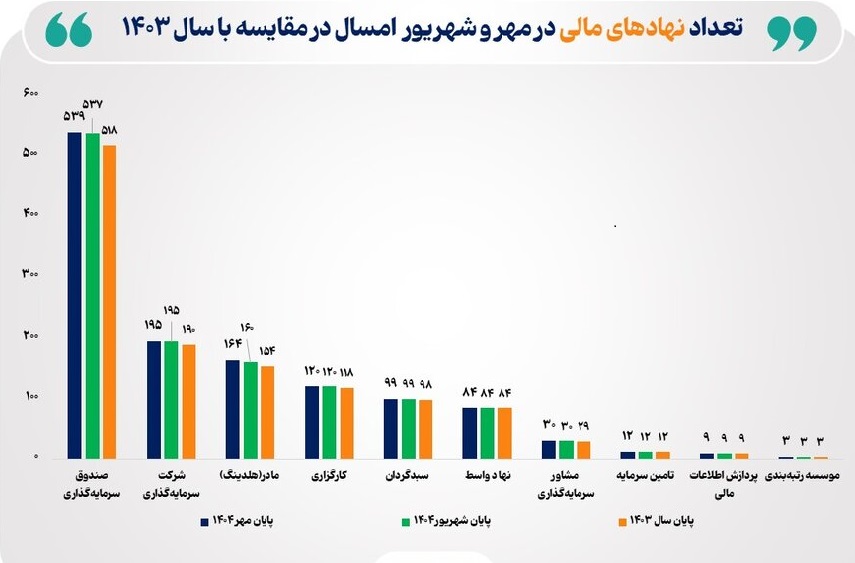 از حیث تعداد، صندوقهای سرمایهگذاری همچنان سهم بالای حدود ۴۳ درصدی را در میان نهادهای مالی به خود اختصاص دادهاند. استقبال سرمایهگذاران از این نهاد مالی بهعنوان مقصد سرمایهگذاری روند صعودی تعداد آنها را استمرار بخشیده و تعداد آنها به ۵۳۹ نهاد در پایان مهر ۱۴۰۴ افزایش یافته است. تعداد صندوقهای سرمایهگذاری در پایان سال گذشته ۵۱۸ و در پایان شهریور امسال ۵۳۷ نهاد بوده است.