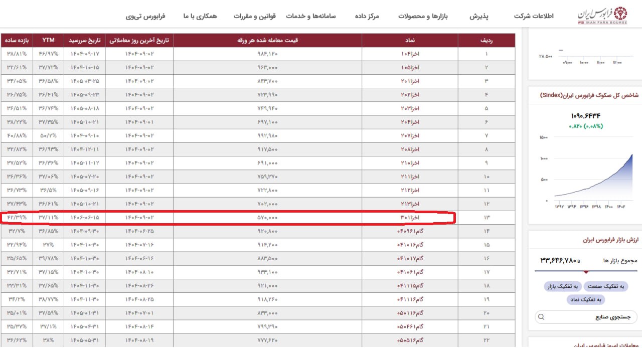 به گزارش دنیای بورس به نقل از ایرنا، بر اساس جدول منتشره در فرابورس ایران، نرخ بازدهی اوراق اسناد خزانه اسلامی (اخزا) و اوراق گام با تاریخهای سررسید آذر ماه امسال تا پایان نیمه نخست ۱۴۰۵ بین ۳۲ تا ۴۲ درصد است.