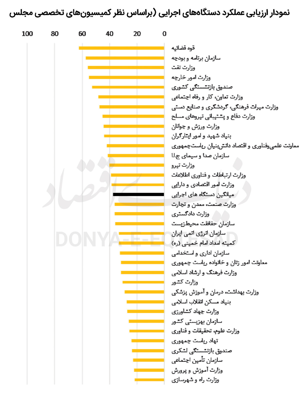 پس از آن، امور اقتصادی با نمره 37.39درصد قرار دارد و امور زیربنایی مانند راه، انرژی و مسکن، با 37.35درصد ارزیابی شدهاند. پایینترین نمره متعلق به «امور اجتماعی و فرهنگی» با 33.88درصد است که گسترهای وسیع از آموزش، سلامت، رفاه اجتماعی و فرهنگ را دربرمیگیرد. این اعداد توزیع عملکرد را کاملا نامتوازن نشان میدهد و از زاویهای دیگر روشن میکند که بعضی حوزهها به دلایل متعدد، چه از نظر حجم تکالیف و چه از نظر امکان اجرا، با موانع بیشتری روبهرو بودهاند.در بررسی عملکرد دستگاهی جزئیات بیشتری مشاهده میشود. قوه قضائیه با نمره 62.5درصد بهترین عملکرد را داشته و سازمان برنامه و بودجه با 57.4درصد در رتبه بعدی قرار میگیرد. وزارت نفت نیز با 55.7درصد جزو دستگاههایی است که عملکرد نسبتا مطلوبی داشتهاند. در مقابل، ضعیفترین عملکردها متعلق به وزارت آموزش و پرورش با 22.3 درصد، وزارت راه و شهرسازی با 21.7درصد و فرماندهی نیروی انتظامی با 21.5درصد است.