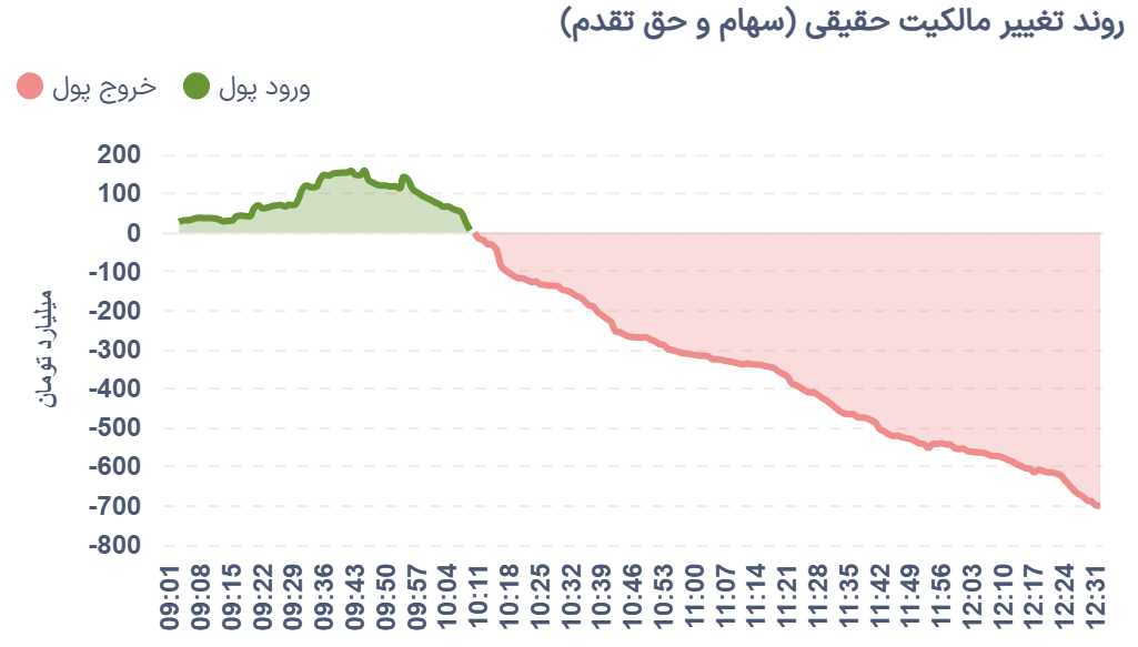 جریان ورود و خروج حقیقیها امروز در ابتدا روندی مثبت داشت، اما این روند پایدار نماند و در ادامه معاملات به سمت خروج حقیقیها تغییر مسیر داد؛ روندی که تا پایان بازار ادامه یافت.