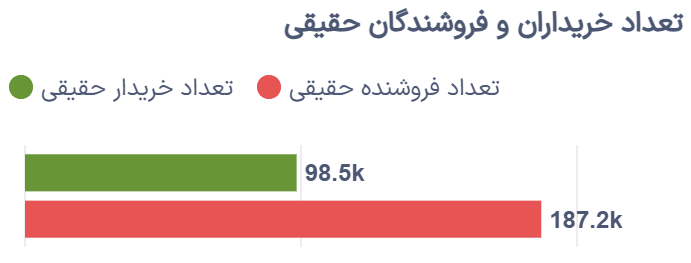 در مجموع، ۹۸.۵ هزار خریدار حقیقی اقدام به تقویت پورتفوی خود کردند؛ اما در مقابل تعداد بیشتری یعنی ۱۸۷.۲ هزار فروشنده حقیقی در سمت عرضه فعال بودند. تداوم خروج حقیقی‌ها حاکی از عدم اطمینان نسبت به روند کوتاه‌مدت بازار است.