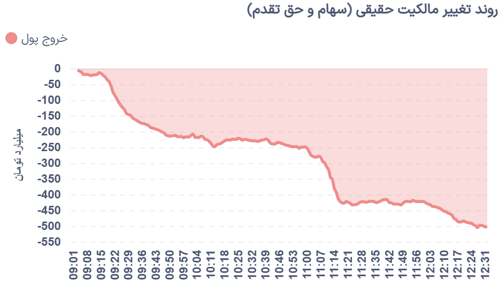 جریان تغییر مالکیت حقیقی‌ها امروز از ابتدا در مسیر خروج قرار گرفت و این روند تا پایان معاملات بدون تغییر ادامه یافت.