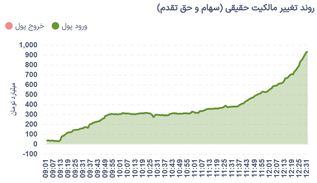 جریان ورود و خروج سرمایه حقیقیها امروز نیز همچون روز گذشته در مجموع به نفع ورود پول حقیقی بود. روند تغییرات مالکیت با جهت مثبت آغاز شد و تا پایان معاملات نیز ادامه یافت.
