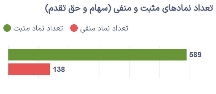 در پایان معاملات امروز، ۵۸۹ سهم و حق تقدم در محدوده مثبت و ۱۳۸ نماد در محدوده منفی بسته شدند که این نسبت، از برتری محسوس تقاضا در کلیت بازار حکایت دارد.
