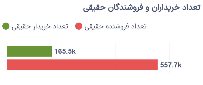 با این حال، از منظر آماری همچنان تعداد فروشندگان حقیقی بیشتر از خریداران بود؛ بهطوریکه حدود ۱۶۵.۵ هزار خریدار حقیقی در برابر ۵۵۷.۷ هزار فروشنده حقیقی در بازار فعالیت داشتند.