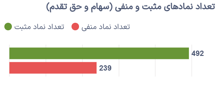 در پایان معاملات امروز، ۴۹۲ سهم و حق تقدم در محدوده مثبت و ۲۳۹ نماد در محدوده منفی بسته شدند که این ترکیب، از برتری نسبی تقاضا در کلیت بازار حکایت دارد.