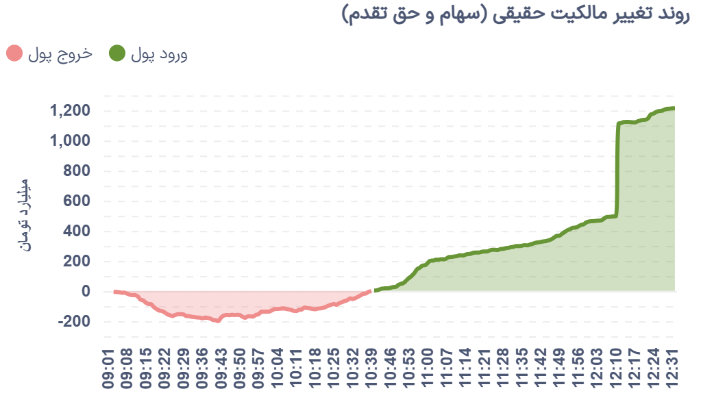 بررسی جریان معاملات نشان میدهد تغییرات مالکیت سهامداران حقیقی در ابتدای بازار با فشار فروش همراه بود، اما با افزایش تقاضا در ادامه معاملات، این روند تغییر کرد و بازار در نهایت با غلبه خرید حقیقیها به کار خود پایان داد؛ موضوعی که نشاندهنده بازگشت تدریجی اعتماد معاملهگران در طول ساعات معاملاتی است.