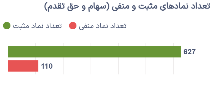 در پایان معاملات، ۶۲۷ سهم و حق تقدم در محدوده مثبت و تنها ۱۱۰ نماد در محدوده منفی بسته شدند که نشاندهنده غلبه قاطع نمادهای سبزپوش در بازار امروز است.