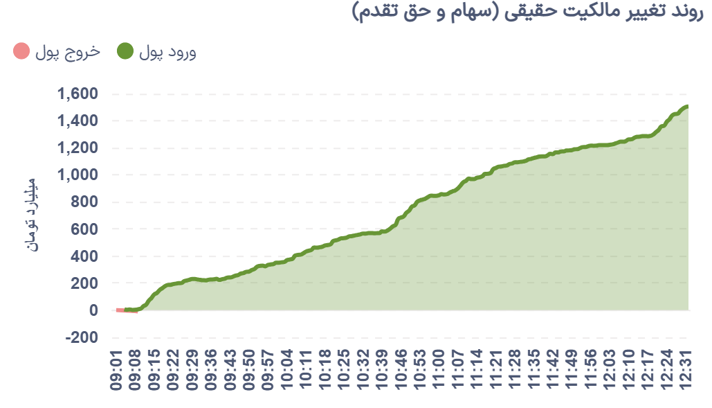 بررسی جریان معاملات نشان میدهد تغییرات مالکیت سهام و حق تقدم از ابتدای بازار در مسیر مثبت قرار داشت و این روند تا پایان معاملات حفظ شد؛ موضوعی که از برتری تقاضا بر عرضه و افزایش تمایل سرمایهگذاران به خرید سهام حکایت دارد.