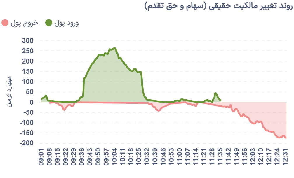 بررسی رفتار معاملهگران نشان میدهد تغییرات مالکیت سهام و حق تقدم در ابتدای معاملات با روندی مثبت همراه بود، اما با افزایش فشار فروش در ادامه بازار، این روند تغییر مسیر داد و در نهایت به منفی ختم شد؛ موضوعی که از افزایش تمایل سرمایهگذاران به شناسایی سود پس از رشدهای اخیر حکایت دارد.