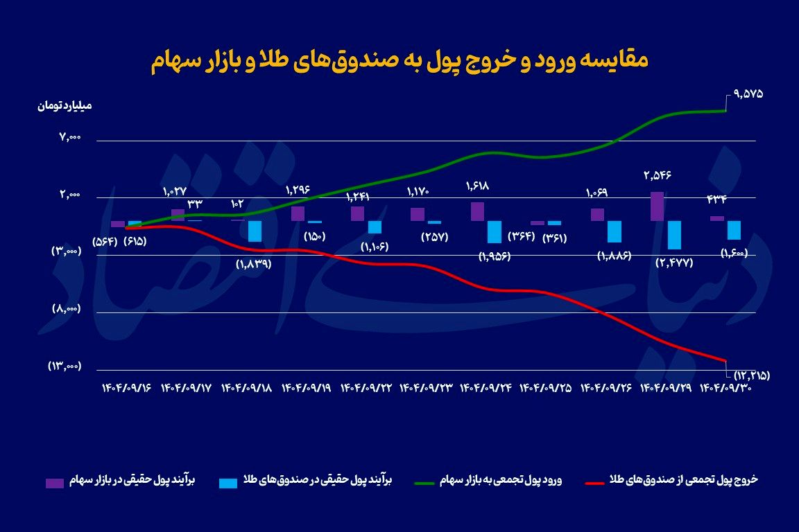 دادههای معاملاتی روزهای اخیر از تغییر معنادار مسیر سرمایههای خرد حکایت دارد؛ بهطوریکه همزمان با ورود حدود ۹.۵ همت پول حقیقی به بورس تهران، بیش از ۱۲ همت سرمایه از صندوقهای طلا خارج شده است؛ جابهجاییای که میتواند نشانه بازنگری سرمایهگذاران در نسبت ریسک و بازده بازارها باشد.