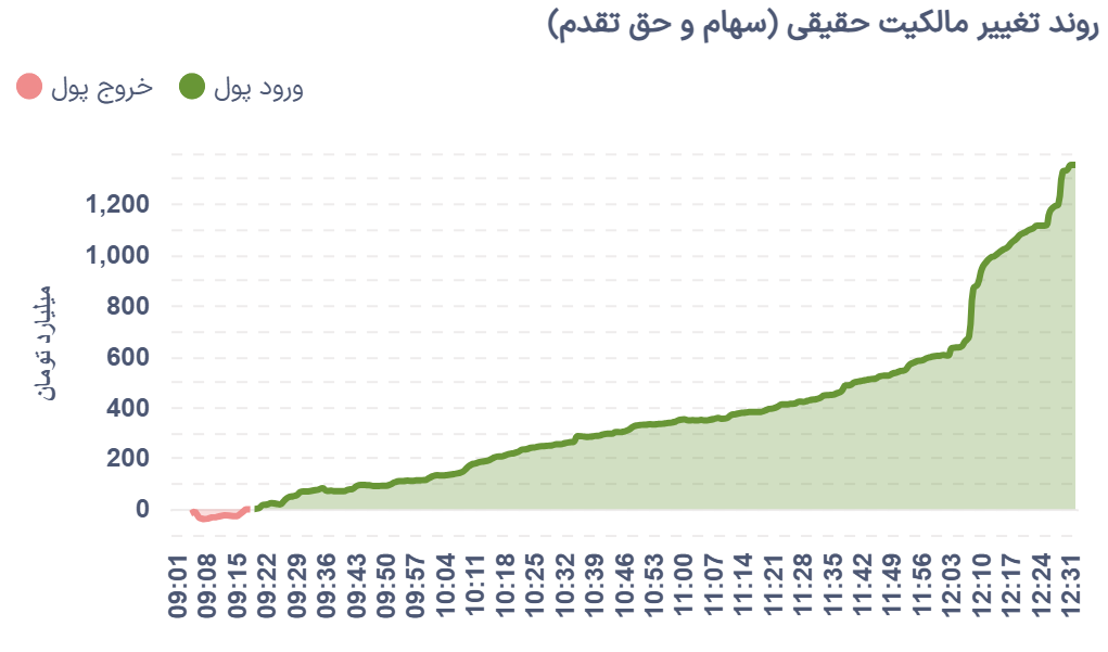 بررسی روند معاملات نشان میدهد که تغییرات مالکیت سهام و حق تقدم در دقایق ابتدایی بازار با غلبه عرضه و روندی منفی آغاز شد، اما این وضعیت پایدار نماند و با افزایش تقاضا، بازار بهتدریج وارد فاز مثبت شد؛ روندی که تا پایان معاملات ادامه یافت.