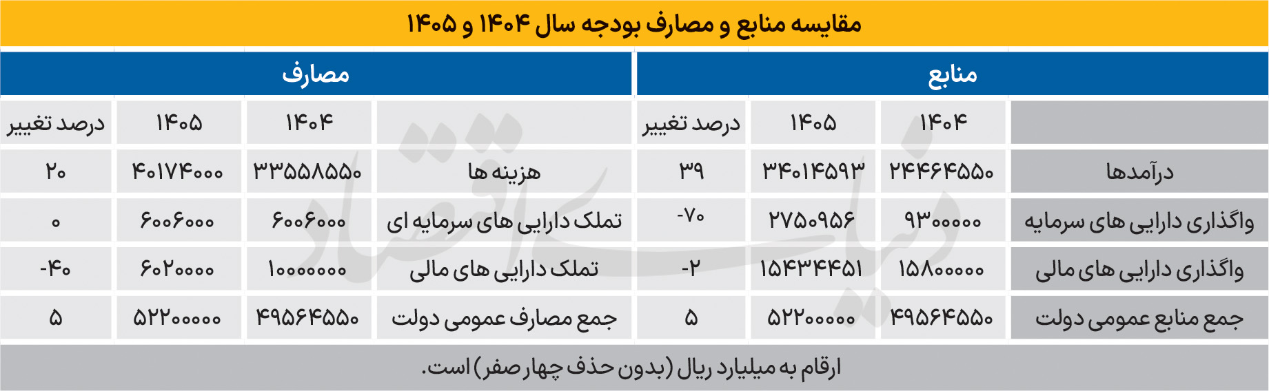 بودجه سال ۱۴۰۵ پس از چند سال در قالب تکمرحلهای به مجلس ارائه شده است. لایحه بودجه در سالهای ۱۴۰۲ تا ۱۴۰۴ به صورت دومرحلهای شامل دو بخش احکام و جداول به مجلس ارسال و بررسی شده با این حال، امسال و با تصویب نمایندگان مجلس، بار دیگر بودجه حالت تکمرحلهای پیدا کرد و احکام و جداول یکجا به مجلس ارائه شدند. کسری تراز عملیاتی بودجه سال ۱۴۰۵، ۶۱۵.۹ همت و منابع حاصل از استفاده از صندوق توسعه ملی نیز حدود ۵۹۰ همت اعلام شده است.وزیر اقتصاد پیش از این در رابطه با با بودجه سال۱۴۰۵ وعده داده بود «بودجه سال آینده به گونهای تدوین شده که کسری آن نزدیک به صفر است و فشاری بر بانک مرکزی وارد نمیشود و تورم هم با این روش کنترل خواهد شد.» وعدهای که توسط مسوولان دولتی در سالهای گذشته نیز اعلام میشد با این حال در عمل محقق نمیشد.