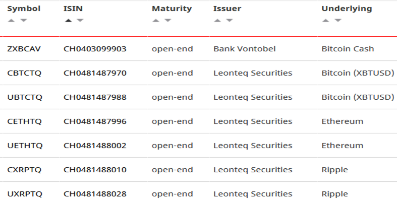 بورس اوراق بهادار سوئیس نیز در حوزه پذیرش ابزارهای مالی مبتنی بر رمزارز از جمله صندوقهای قابلمعامله رمزارز فعال است. اولین ابزار مالی مبتنی بر رمزارز در بورس سوئیس، ابزار ساختاریافته مبتنی بر بیتکوین بود که در نوامبر ۲۰۱۶ میلادی پذیرفته شد تا قیمت بیتکوین را ردگیری کند. این بورس توسعه ابزارهای مبتنی بر رمزارز را ادامه داد و موفق شده در اکتبر سال ۲۰۲۵ میلادی، بیش از ۵۰۰ نماد معاملاتی متشکل از انواع ابزار مالی مبتنی بر رمزارزها را در دسترس سرمایهگذاران قرار دهد. از این تعداد نماد معاملاتی، حدود ۲۰۶ نماد مربوط به صندوقهای قابل معامله رمزارز است که همانطور که در فصل قبل بیان شد این صندوقها در قابل ETP ایجاد شدند. این صندوقها قابلیت معامله به یورو، دلار و فرانک سوئیس را دارا هستند.