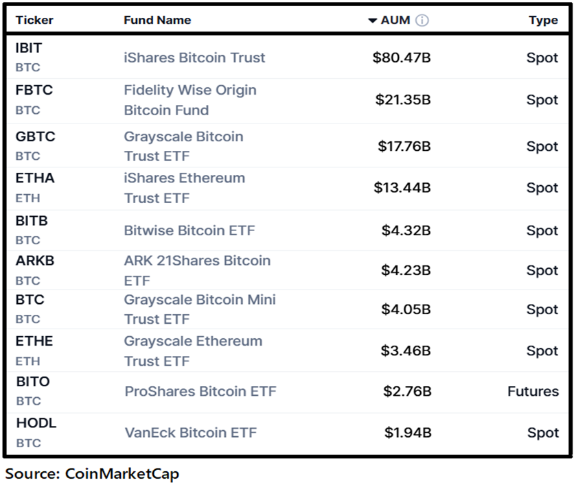 با گذشت حدود یک سال از صدور مجوز راهاندازی صندوقها با پشتوانه رمزارز در ایالات متحده آمریکا، رشد بیسابقهای در میزان داراییهای تحت مدیریت این صندوقها ایجاد شده است. در جدول زیر که برگرفته از وبسایت CoinMarketCap در ۱۰ نوامبر ۲۰۲۵ میلادی است، ۱۰ صندوق قابلمعامله رمزارز برتر دنیا از لحاظ ارزش داراییهایی تحت مدیریت آورده شدهاند که همه آنها در آمریکا هستند. از بین این ۱۰ صندوق تعداد ۹ صندوق به طور مستقیم در رمزارزهایی مانند بیتکوین و اتریوم سرمایهگذاری میکنند و فقط صندوق Proshares به طور غیرمستقیم در بیتکوین سرمایهگذاری میکند و استراتژی اصلی آن سرمایهگذاری در قراردادهای آتی بیتکوین است و امکان خرید نقدی بیتکوین را ندارد. بررسی امیدنامه صندوقهای قابلمعامله رمزارز که در جدول زیر آورده شدهاند، نشان میدهد که این صندوقها فقط در یک رمزارز شامل بیتکوین یا اتریوم سرمایهگذاری میکنند.